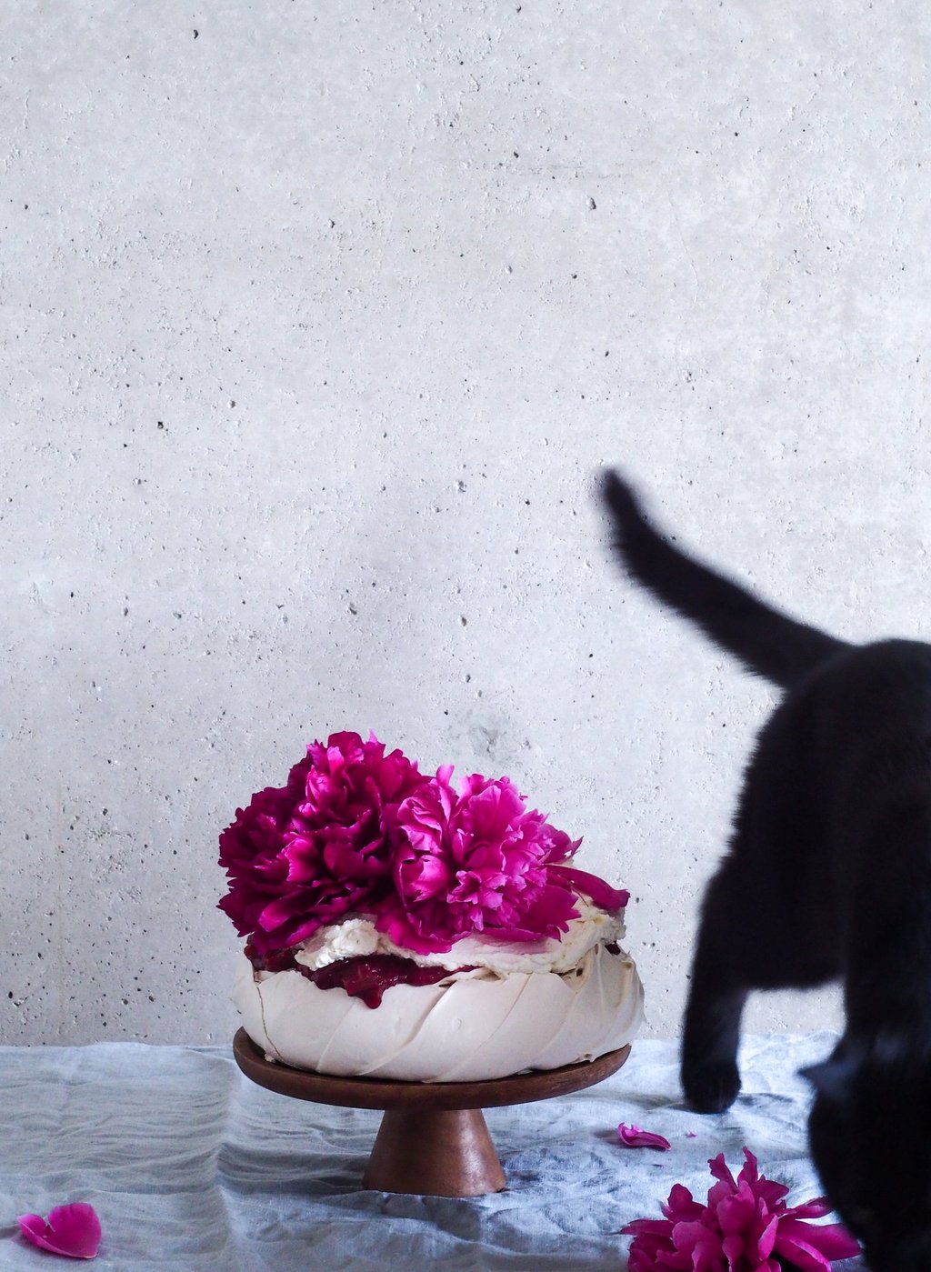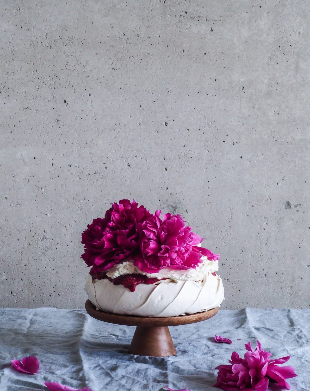 Bezę wyłóż na paterę. Rozprowadź na niej uduszony rabarbar, na górę wyłóż krem. Możesz też zrobić odwrotnie. Mi zależało na tym, żeby kwiaty kontrastowały z bielą kremu. Udekoruj jadalnymi kwiatami jakie masz pod ręką, u mnie - różowe piwonie.